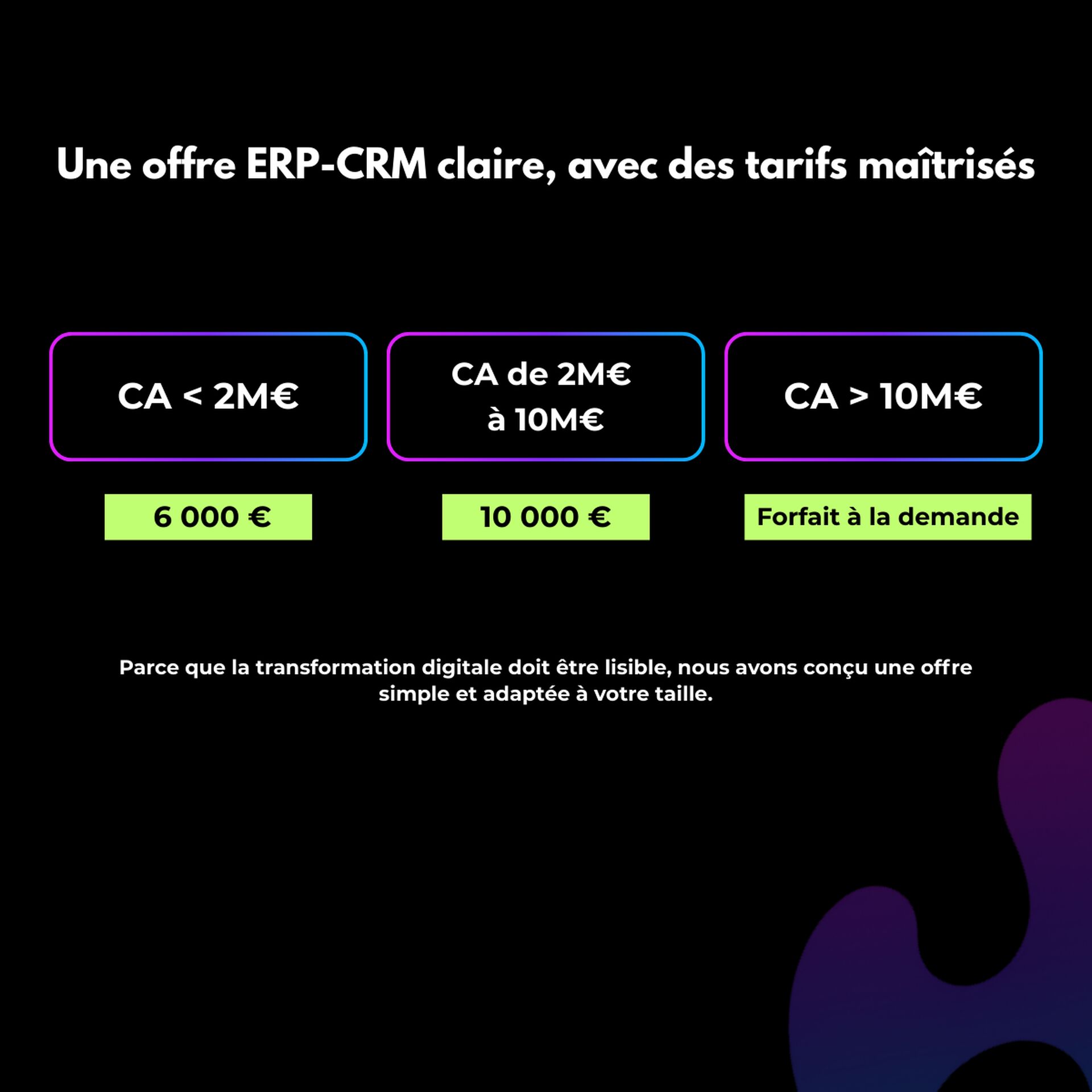 Parce que la transformation digitale doit être lisible et accessible, nous avons conçu une offre simple, adaptée à la taille de votre entreprise.